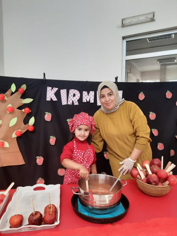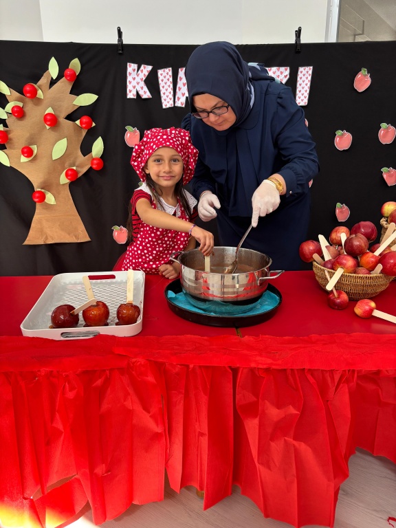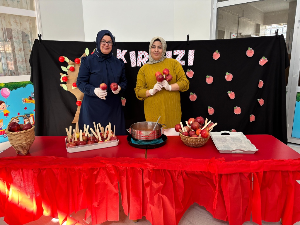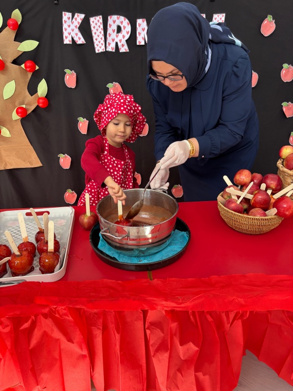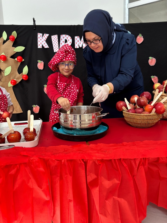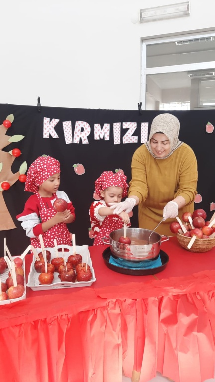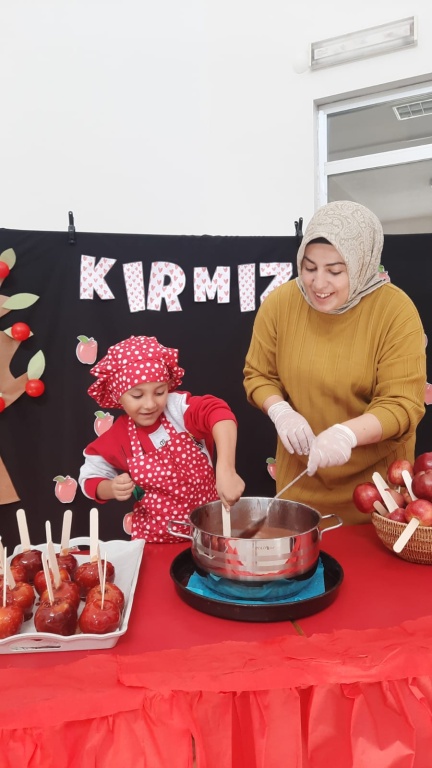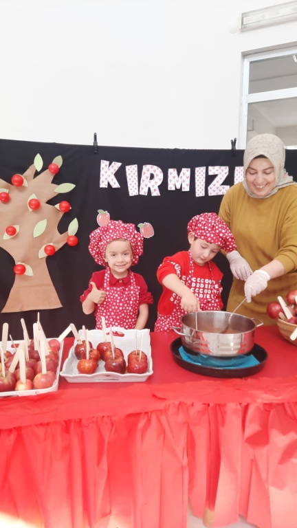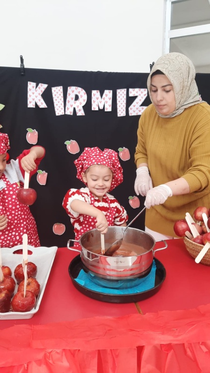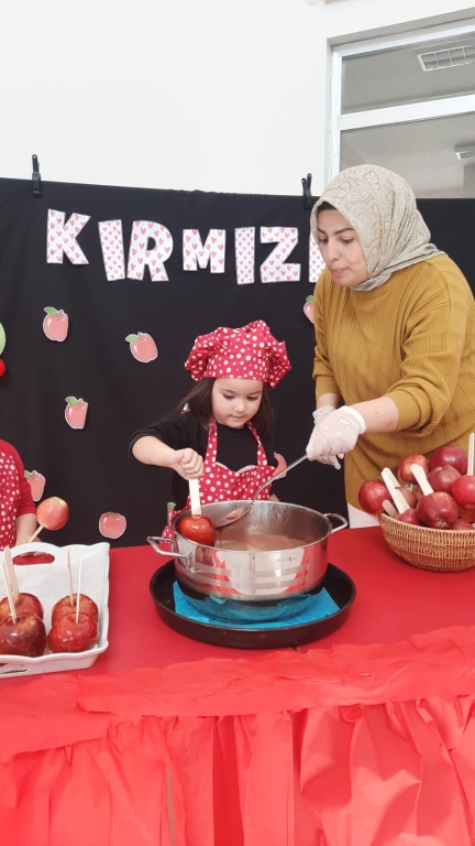 Bugün okulumuzda kırmızı rengini pekiştirmek için renkli ve lezzetli bir yol seçtik: Elma şekeri yaptık!
